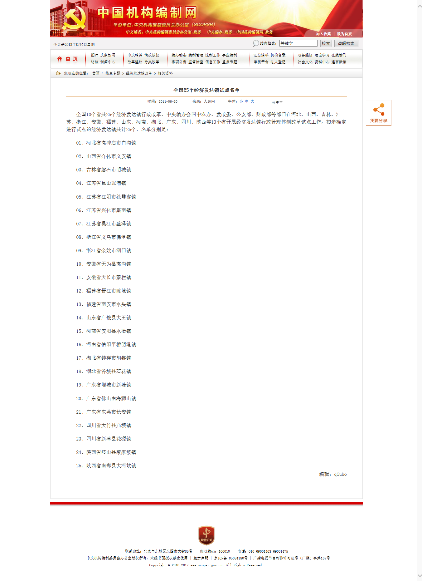 20106月,中央編辦會(huì)同中農(nóng)辦、國(guó)家發(fā)改委、公安部、財(cái)政部等部門在13個(gè)省25個(gè)鎮(zhèn)開展經(jīng)濟(jì)發(fā)達(dá)鎮(zhèn)行政管理體制改革試點(diǎn)工作,并在工作座談會(huì)發(fā)布全國(guó)25個(gè)經(jīng)濟(jì)發(fā)達(dá)鎮(zhèn)試點(diǎn)名單。